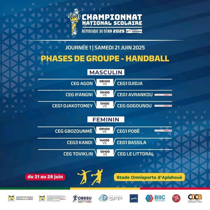 Les rencontres de handball de 9h, 10h et 11h seront en direct sur la télévision nationale (Bénin TV).