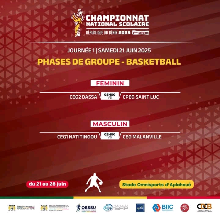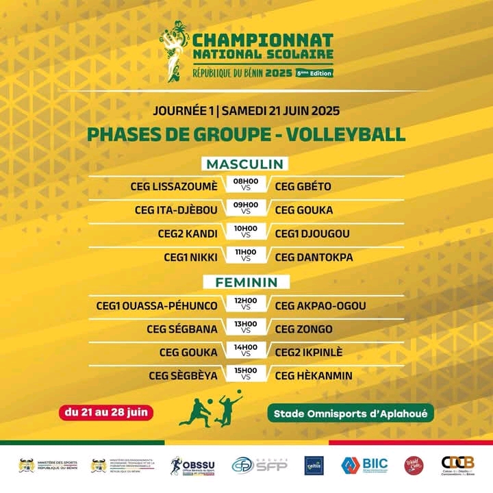 Chez les volleyeurs, la matinĂ©e est consacrĂ©e aux garçons avec les rencontres CEG LissazoumĂš (Zou) vs CEG GbĂ©to (Littoral) Ă 8h 00, CEG Ita-DjĂšbou (Plateau) vs CEG Gouka (Collines) Ă 9h 00, CEG2 Kandi (Alibori) vs CEG1 Djougou (Donga) Ă 10h 00 et CEG1 Nikki (Borgou) vs CEG Dantokpa ( Littoral) Ă 11h 00. L’aprĂšs-midi verra dĂ©filer les filles du CEG1 Ouassa-PĂ©hounco (Atacora) et du CEG Akpao-Ogou (Donga) Ă 12h 00, celles du CEG SĂ©gbana (Alibori) et CEG Zongo (Borgou) Ă 13h 00, le CEG Gouka (Collines) et le CEG2 IkpinlĂš (Plateau) Ă 14h 00 et enfin le CEG SĂšgbĂšya (Littoral) et le CEG HĂškanmin Ă 15h 00