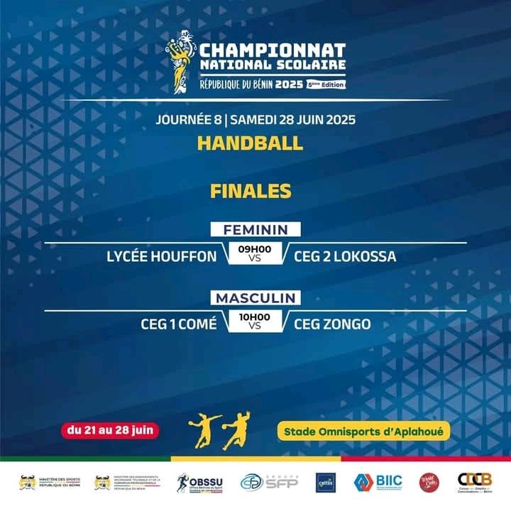 En finale du handball, chez les filles, le Lycée Houffon affronte à 9h le CEG 2 Lokossa et à 10h, les garçons du CEG 1 Comé seront face au CEG Zongo.
