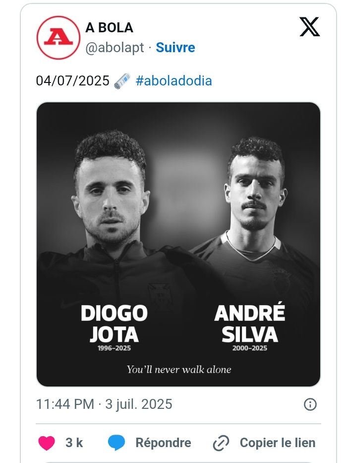 Cette subite disparition a laissé le monde du football sans voix. En Europe, les hommages ne cessent de se multiplier. Au Portugal,c’est la UNE dans presque tous les journaux. Au lendemain du triste événement, Diogo Jota est salué par l’ensemble de la presse lusophone. « Vous ne marcherez jamais seuls » titre le journal A Bola dans une Une pleine page, avec les deux hommes en photo, en noir et blanc. Leurs dates de naissance et de décès sont inscrites en dessous. Le quotidien consacre une large partie de son édition à la mémoire des deux hommes.