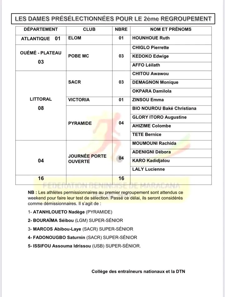 Inscrits dans le cadre de la préparation des équipes nationales (masculine et féminine) du Bénin pour la Mara’Can Bissau 2025, ces regroupements visent à détecter les talents béninois afin de constituer une équipe solide pouvant défendre brillamment les couleurs nationales béninoises en terre guinéenne. Au total, 38 athlètes issus de divers clubs et départements sont convoqués. Chez les Dames, la liste féminine comprend 16 joueuses provenant des départements de l’Atlantique, de l’Ouémé-Plateau, et du Littoral. Le département du Littoral est le mieux représenté avec des joueuses de clubs tels que SACR, Victoria, et Pyramide. Pyramide, à lui seul, voit quatre de ses joueuses présélectionnées. Ci-dessous la liste des présélectionnées.